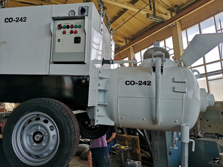 Пневмонагнетатель СО-242 состоит из смесителя с перемешивающим устройством, пневмопанели , пульта управление. Смеситель представляет собой резервуар цилиндрической формы с эллиптическими днищами.Внутри резервуара смонтировано перемешивающее устройство,состоящее из вала и лопастей, кинематически связанное с мотор-редуктором.В верхней части резервуара расположен загрузочный люк с крышкой,герметически фиксирующейся замком,состоящим из рамки и ручки. На крыше установлен кран для сброса давления воздуха из резервуара.Пневмопанель состоит из кранов управления,обратного клапан,предохранительного клапан и манометра.Принцип работы смесителя основан на порционной подаче раствора из резервуара под воздействием сжатого воздуха и лопастей перемешивающего устройства в напорный патрубок.