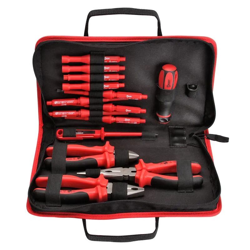 В наборе представлены профессиональные диэлектрические пассатижи, бокорезы и длинногубцы в красно-черной цветовой гамме