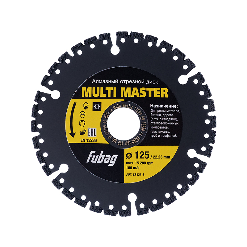 Алмазный отрезной диск для бетона с сегментной режущей кромкой диаметром 125 мм и посадочным отверстием 22.2 мм. Рекомендован для резки такого материала как: строительные материалы: металл, бетон, дерево (в том числе, и с гвоздями), стекловолоконные композиты, пластиковые трубы и профили.