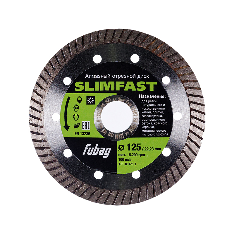 Алмазный отрезной диск для бетона с турбо режущей кромкой диаметром 125 мм и посадочным отверстием 22.2 мм. Рекомендован для резки такого материала как: натуральный и искусственный камень, плитка, гипсокартон, армированный бетон, красный кирпич, металлический листовой профиль.