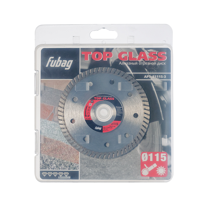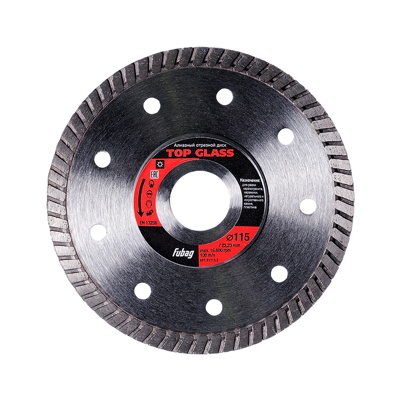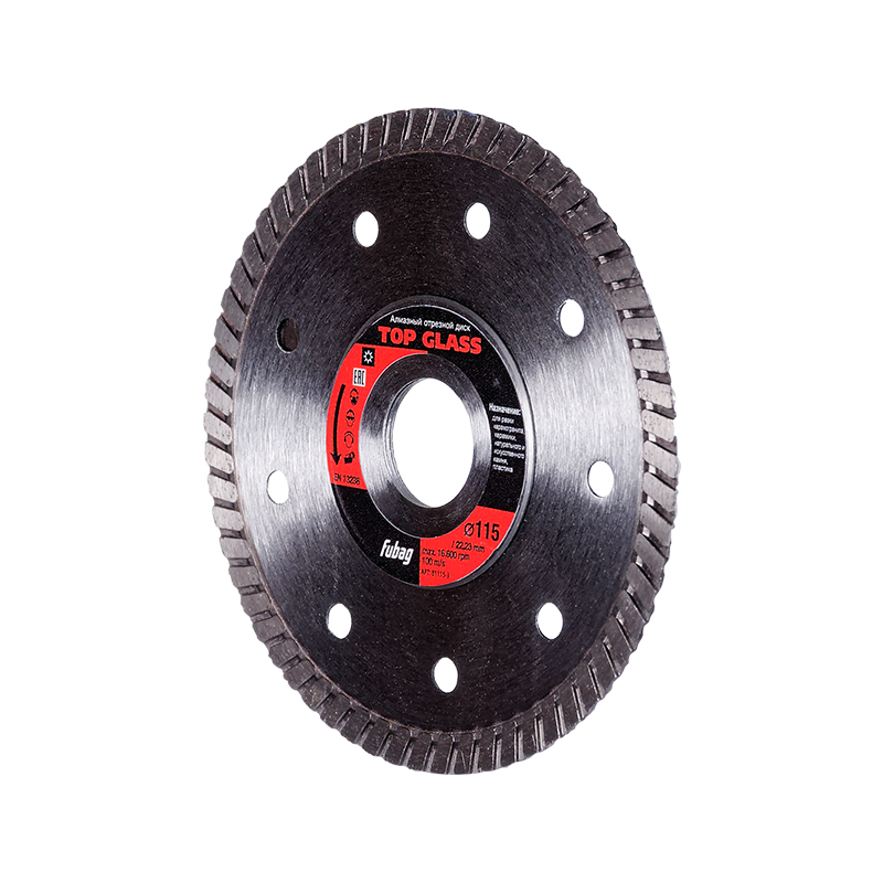 Алмазный отрезной диск для керамогранита с турбо режущей кромкой диаметром 115 мм и посадочным отверстием 22.2 мм. Рекомендован для резки такого материала как: керамогранит, керамика, натуральный и искусственный камень, пластик.