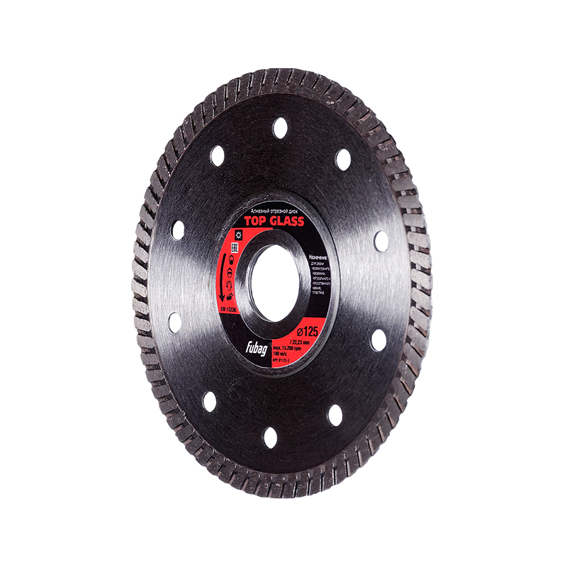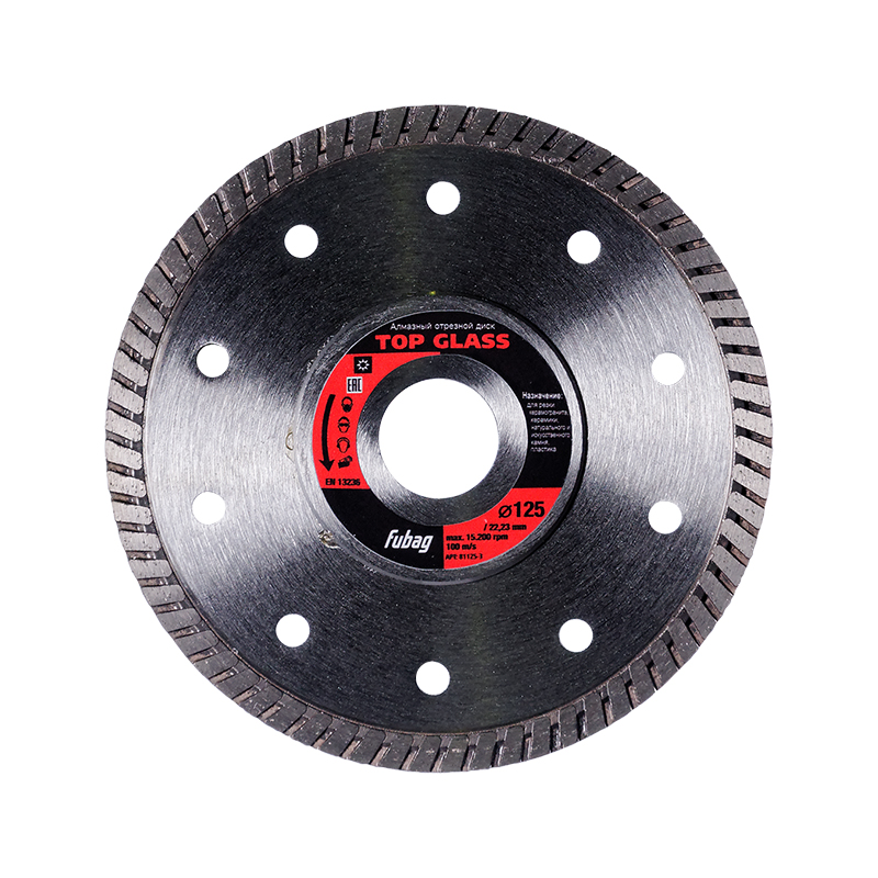 Алмазный отрезной диск для керамогранита с турбо режущей кромкой диаметром 125 мм и посадочным отверстием 22.2 мм. Рекомендован для резки такого материала как: керамогранит, керамика, натуральный и искусственный камень, пластик.