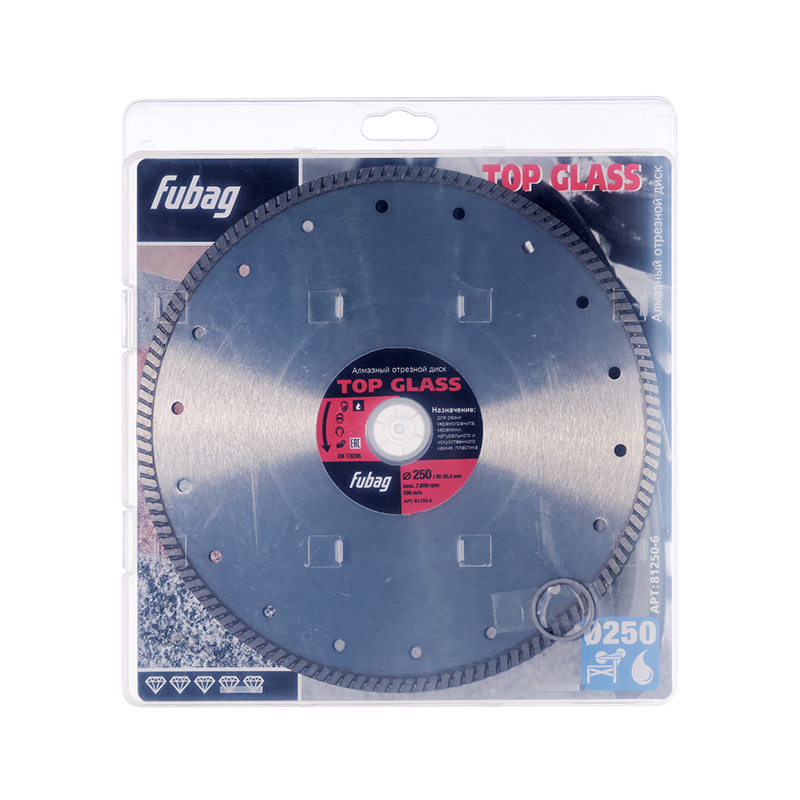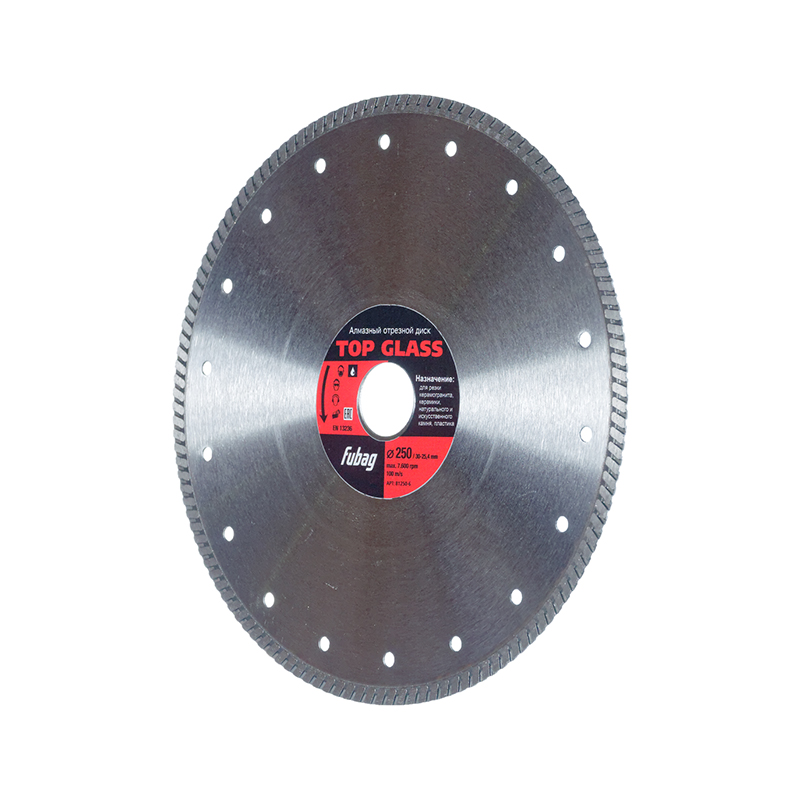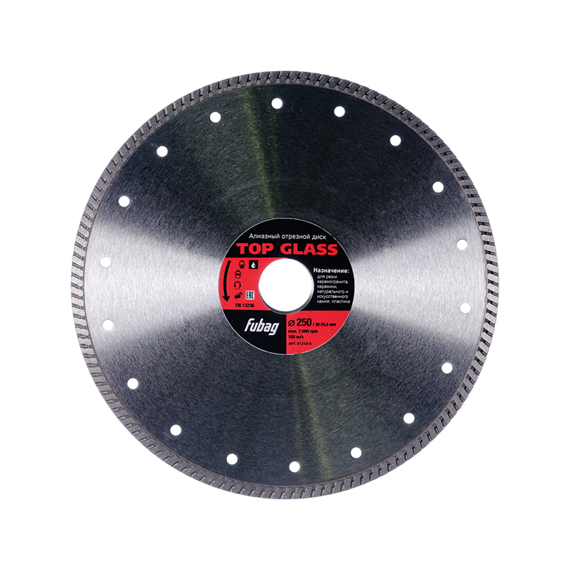 Алмазный отрезной диск для керамогранита с турбо режущей кромкой диаметром 250 мм и посадочным отверстием 30-25.4 мм. Рекомендован для резки такого материала как: керамогранит, керамика, натуральный и искусственный камень, пластик.
