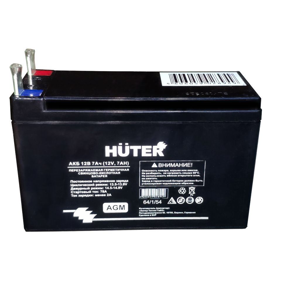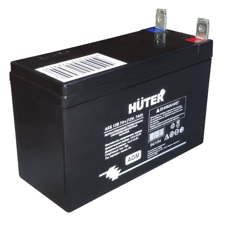Аккумуляторные батареи свинцово-кислотные, герметичные. Предназначены для запуска бензиновых электрогенераторов, оснащённых электрическим стартером. Могут применяться, так же, и для другой бензиновой техники со схожими техническими параметрами. Аккумуляторы HUTER изготовлены при помощи технологии AGM (Absorbent Glass Mat). Отличие батарей AGM от классических в том, что в них содержится абсорбированный электролит, а не жидкий, что даёт ряд преимуществ в свойствах аккумулятора: 1) Не требуют обслуживания. 2) Значительно меньший саморазряд. 3) До 2,5 раз большая скорость заряда. 4) Способность хорошо принимать заряд. 5) Не чувствительны к кратковременному «глубокому» разряду. 6) Конструкция герметизированная, что предотвращает утечку кислоты и коррозию клемм. 7) Более безопасная работа: при правильной зарядке батарей исключается возможность выделения газов и опасность взрыва. 8) Герметизированная конструкция позволяет устанавливать батарею почти в любом положении (вверх дном не рекомендуется). 9) Уверенная работа при низких температурах. 10) Увеличенный срок службы в условиях повышенной вибрации. В ассортименте компании 2 варианта батарей: АКБ 12В 7Ач Huter – для генераторов DY3000LX, DY4000LX и аналогичных. АКБ 12В 12Ач Huter для генераторов DY6500LX/LXA/LXW, DY8000LX/LXA/LX-3, DY9500LX/LX-3 и аналогичных.