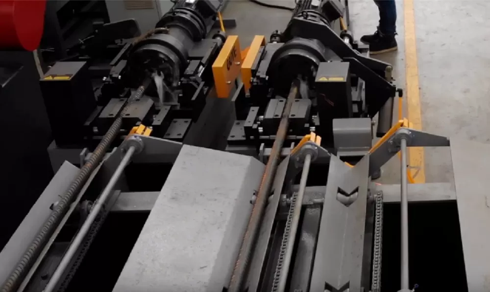 Многофункциональная автоматическая линия мерной резки, сортировки с функциями накатки резьбы и холодной высадки. Диаметр резки 16-50мм. Диаметр накатки резьбы 16-40мм. Диаметр высадки прессом 16-32мм. Частота реза 2,5 реза в минуту.