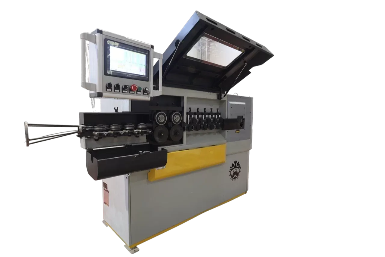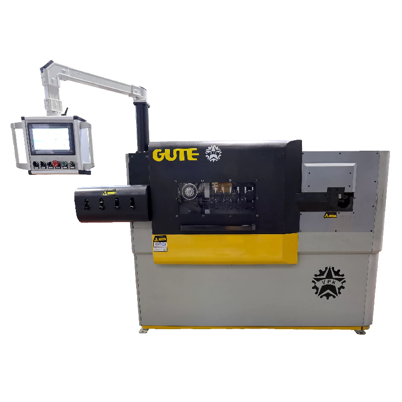 Правильно-гибочный станок с ЧПУ для работы с арматурной сталью. Обрабатывает проволоку ВР1 3-5 мм и арматуру диаметром до 8 мм. Максимальная скорость протяжки 75 м/мин. Мощность 12 кВт. Применяется для изготовления хомутов, углов, деталей специальной формы и т. д. Он может автоматически выполнять функции правки, гибки, резки и подсчета готовых изделий из арматуры. В оборудовании используется система ЧПУ для управления системой с помощью сенсорного экрана и ПЛК (программируемый логический контроллер). Станок обладает высокой точностью обработки, стабильным и надежным качеством, а также большим объемом памяти для хранения программ. Оборудование простое в эксплуатации и легко настраивается, что позволяет сэкономить большой объем труда и минимизировать отходы. Это незаменимая составляющая при строительстве зданий и сооружений. Также оборудование соответствует современным национальным стандартам.