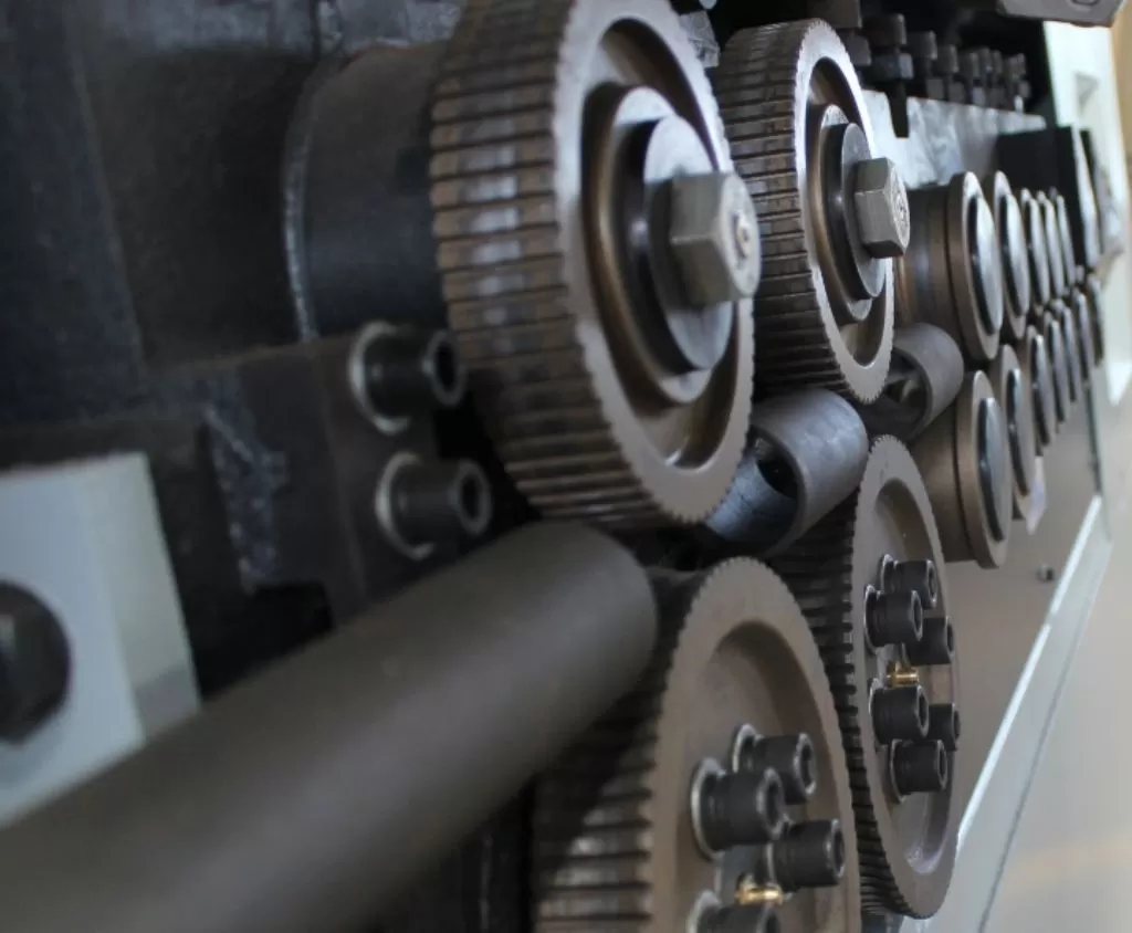 Правильно-гибочный станок с ЧПУ для работы с арматурной сталью. Обрабатывает арматуру диаметром до 12 мм. Максимальная скорость протяжки 75-100 м/мин. Мощность 31 кВт.