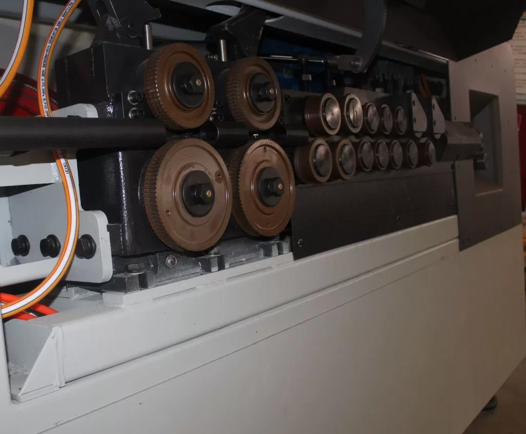 Правильно-гибочный станок с ЧПУ для работы с арматурной сталью. Обрабатывает арматуру диаметром до 14 мм. Максимальная скорость протяжки 75-100 м/мин. Мощность 45 кВт.