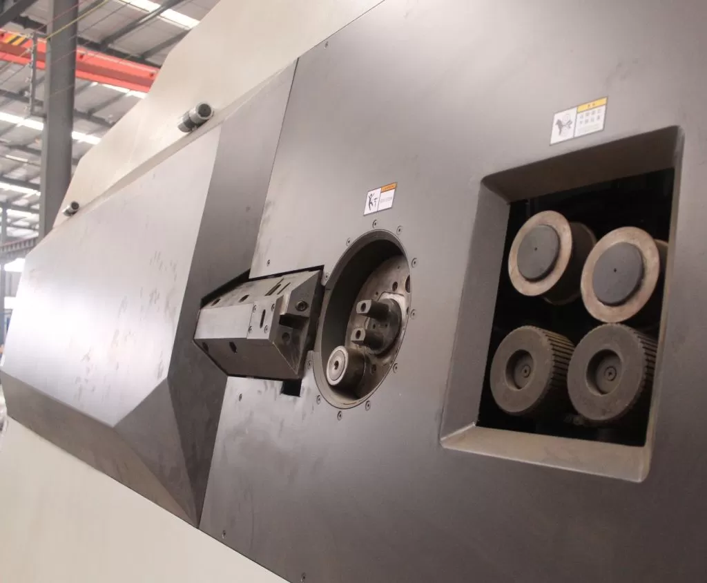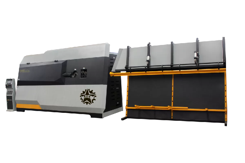 Правильно-гибочный станок с ЧПУ работает с прутковой арматурой и в бухтах до 16мм! Максимальная скорость протяжки 75-100 м/мин. Мощность 65 кВт. Оснащен 9-метровой приемной линией. Изготавливает нестандартные скобы с крюками на обоих концах.