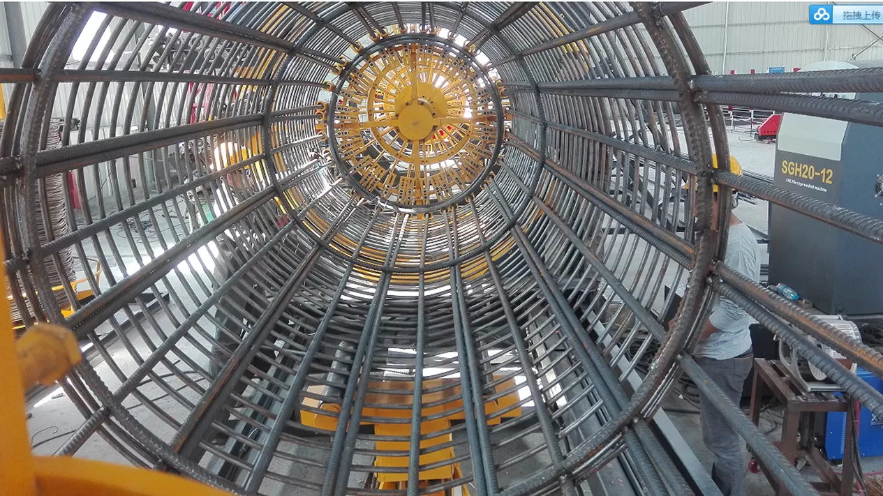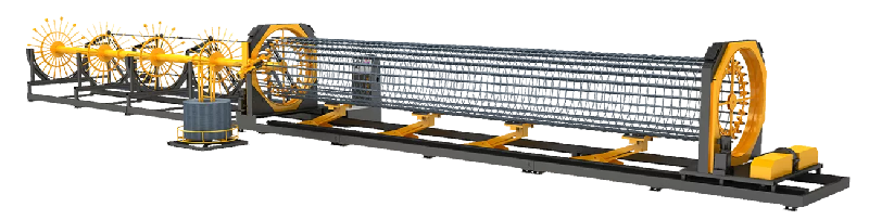 Автоматическая линия с ЧПУ для навивки и сварки каркаса из арматурной стали с функцией автоматической сварки. Скорости движения и выпрямления арматуры контролируются. Диаметр каркаса 650-1500 мм. Диаметр навивочной арматуры 5-14 мм. Максимальная длина каркаса 12 метров.