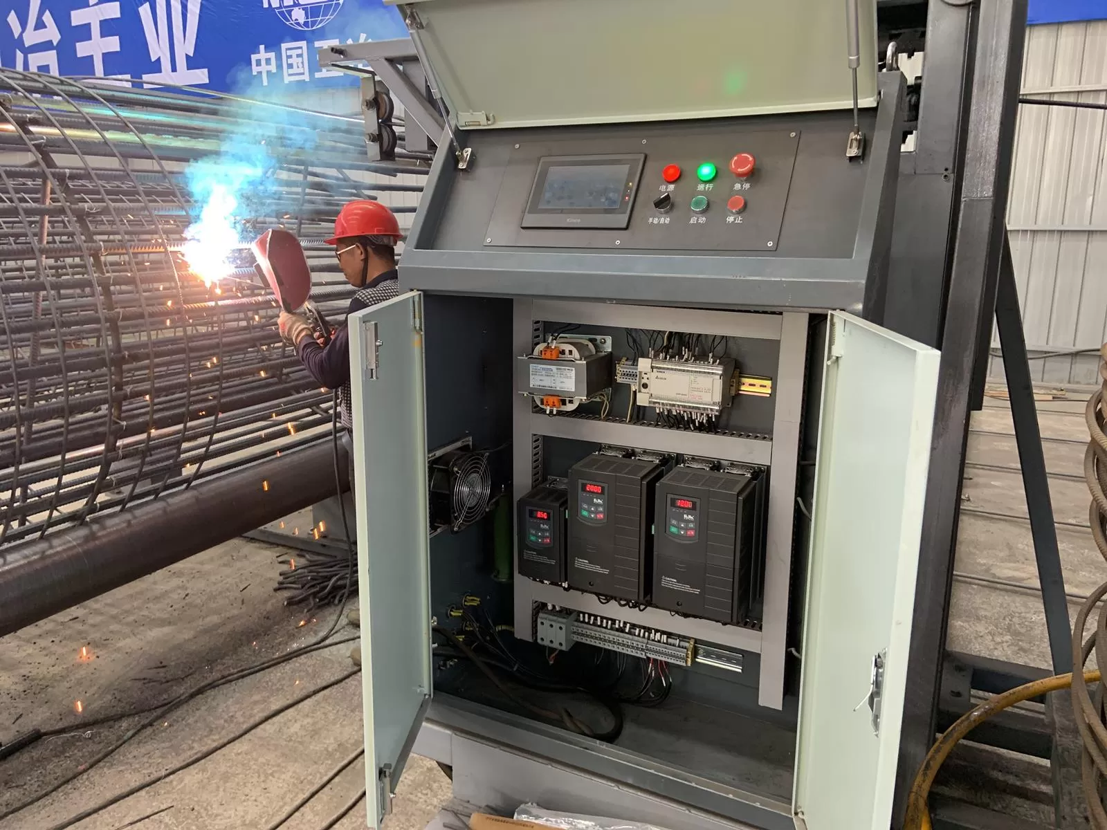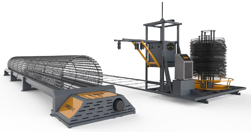 Скорости движения и выпрямления арматуры контролируются. Диаметр каркаса 1000-2200 мм. Диаметр навивочной арматуры 5-14 мм. Максимальная длина каркаса 12 метров.