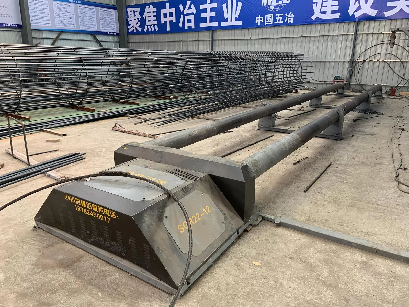 Полуавтоматический станок с ЧПУ для навивки и сварки каркаса из арматурной стали. Скорости движения и выпрямления арматуры контролируются. Диаметр каркаса 1000-2200 мм. Диаметр навивочной арматуры 5-14 мм. Максимальная длина каркаса 16 метров.