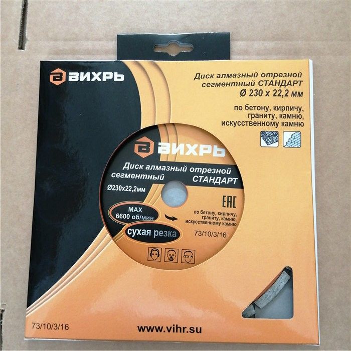 Диск алмазный отрезной сегментный СТАНДАРТ, 230 х 22,2 мм, сухая резка Вихрь — это алмазный отрезной диск, который используется совместно с угловыми шлифмашинами (болгарками) для сухой резки гранитных, бетонных, кирпичных и каменных изделий.Особенности: