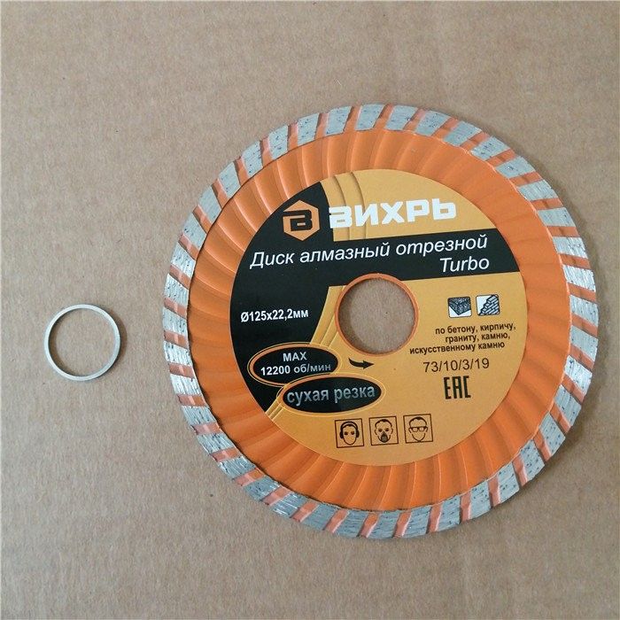 Диск алмазный отрезной Турбо 125 х 22,2 мм, сухая резка Вихрь — это алмазный отрезной диск, который используется совместно с угловыми шлифмашинами (болгарками) для сухой резки гранитных, бетонных, кирпичных и каменных изделий.Особенности: