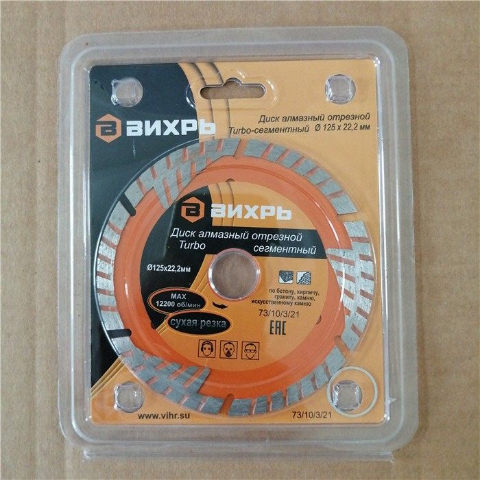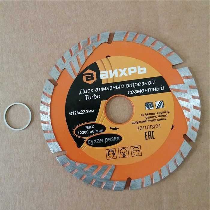 Диск алмазный отрезной Турбо — сегментный, 125 х 22,2 мм, сухая резка Вихрь — это алмазный отрезной диск, который используется совместно с угловыми шлифмашинами (болгарками) для сухой резки гранитных, бетонных, кирпичных и каменных изделий.Особенности: