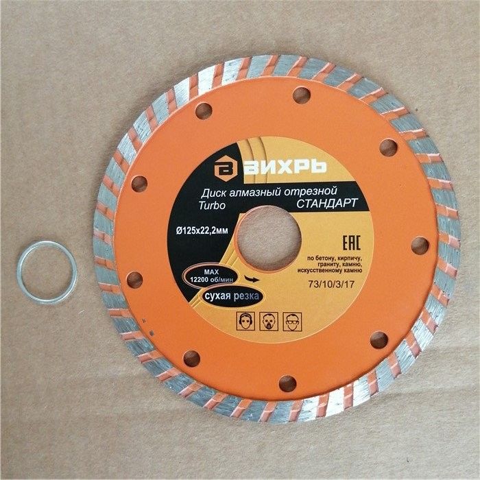 Диск алмазный отрезной Турбо СТАНДАРТ, 125 х 22,2 мм, сухая резка Вихрь — это алмазный отрезной диск, который используется совместно с угловыми шлифмашинами (болгарками) для сухой резки гранитных, бетонных, кирпичных и каменных изделий.Особенности: