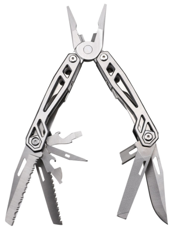 Надежный инструмент, включает 2 ножа, пассатижи, напильник, битодержатель с 4 битами, пилу, шило и 2 открывашки. Изготовлен из нержавеющей стали. В нейлоновом чехле.