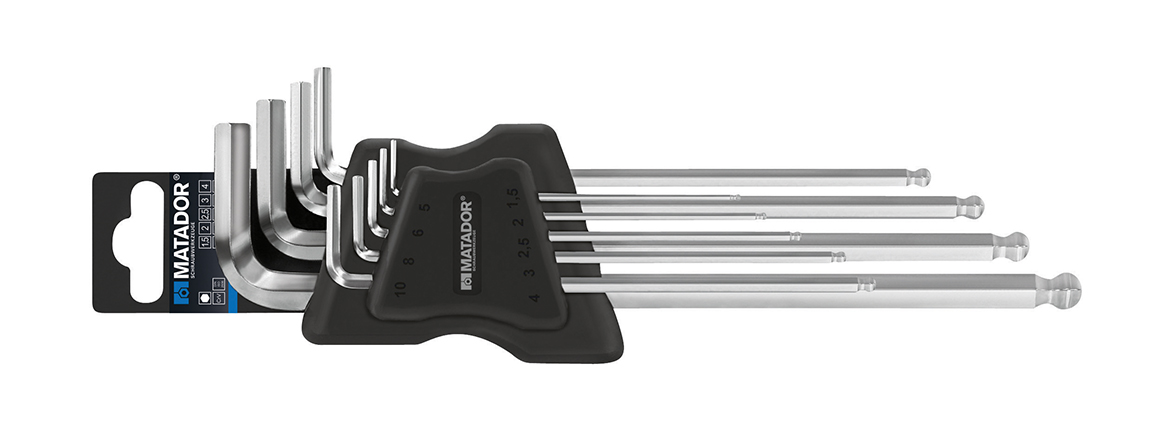 Длинные шестигранники с шаровидными головками размером 1.5-2.0-2.5-3.0-4.0-5.0-6.0-8.0-10.0мм из хром-ванадия, на держателе.