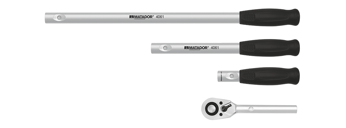 С тремя рукоятками длиной 220мм, 360мм и 570мм. Реверсивная трещотка под головки 1/2″. С кнопочным замком. С рычагом переключения передач для правого и левого направления вращения.