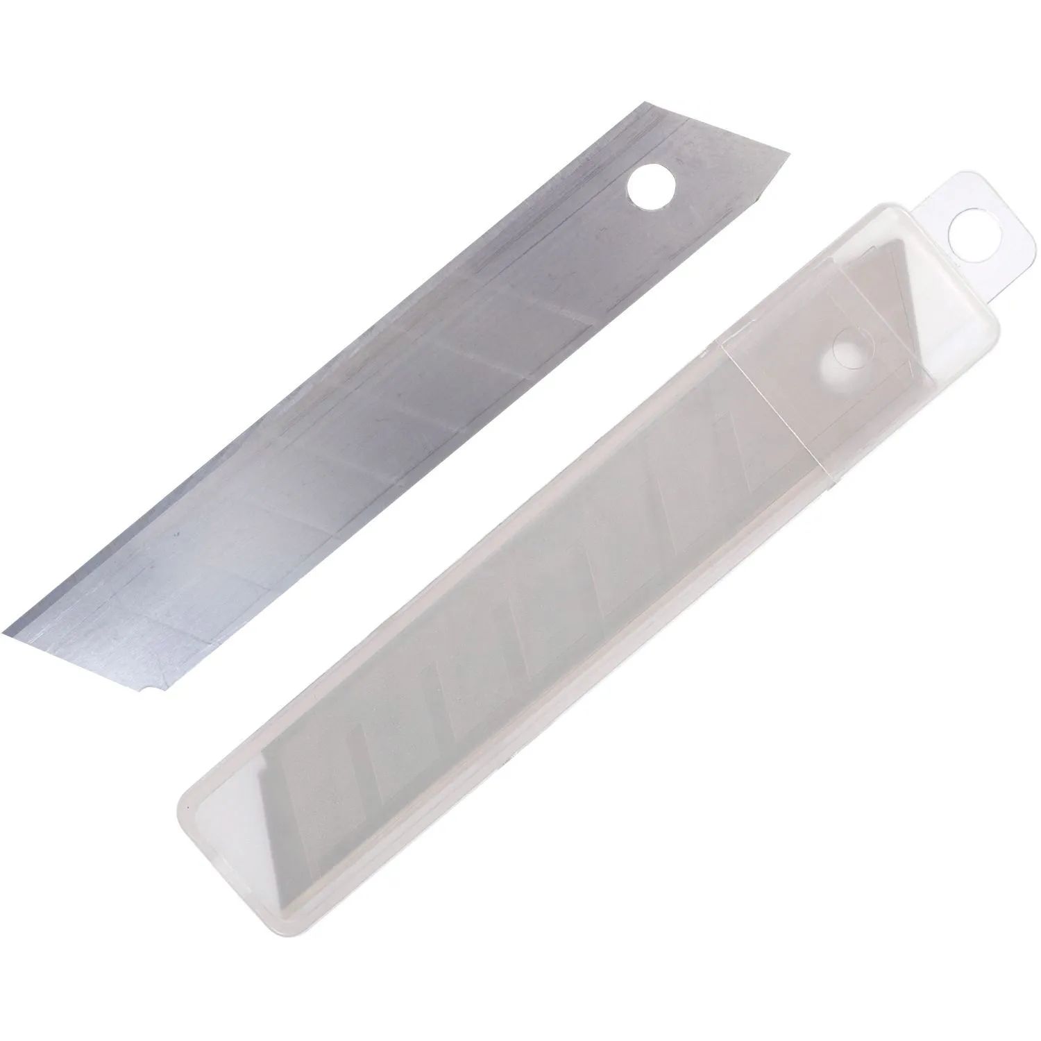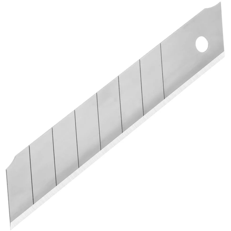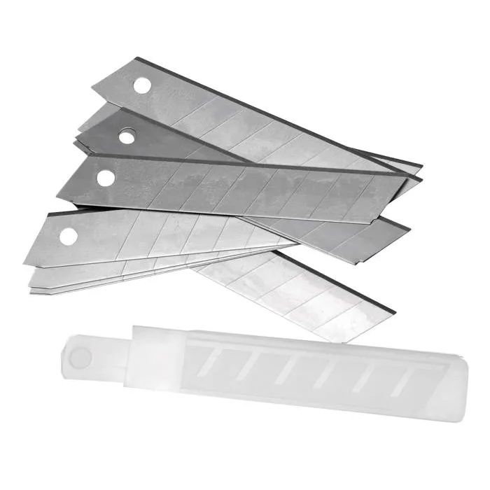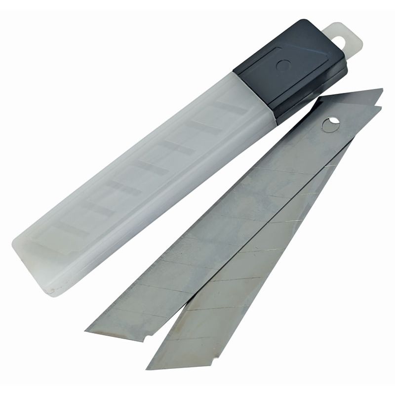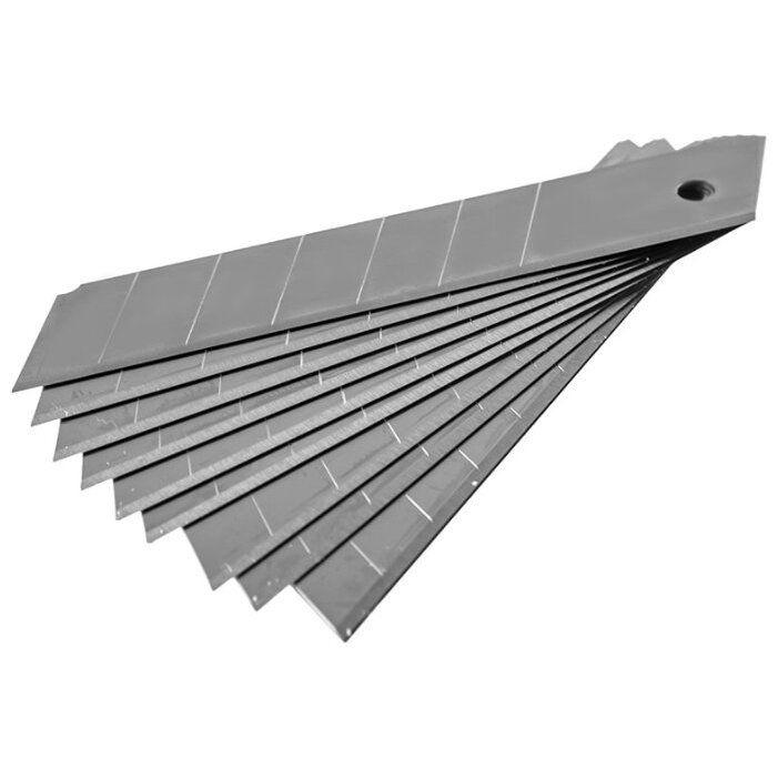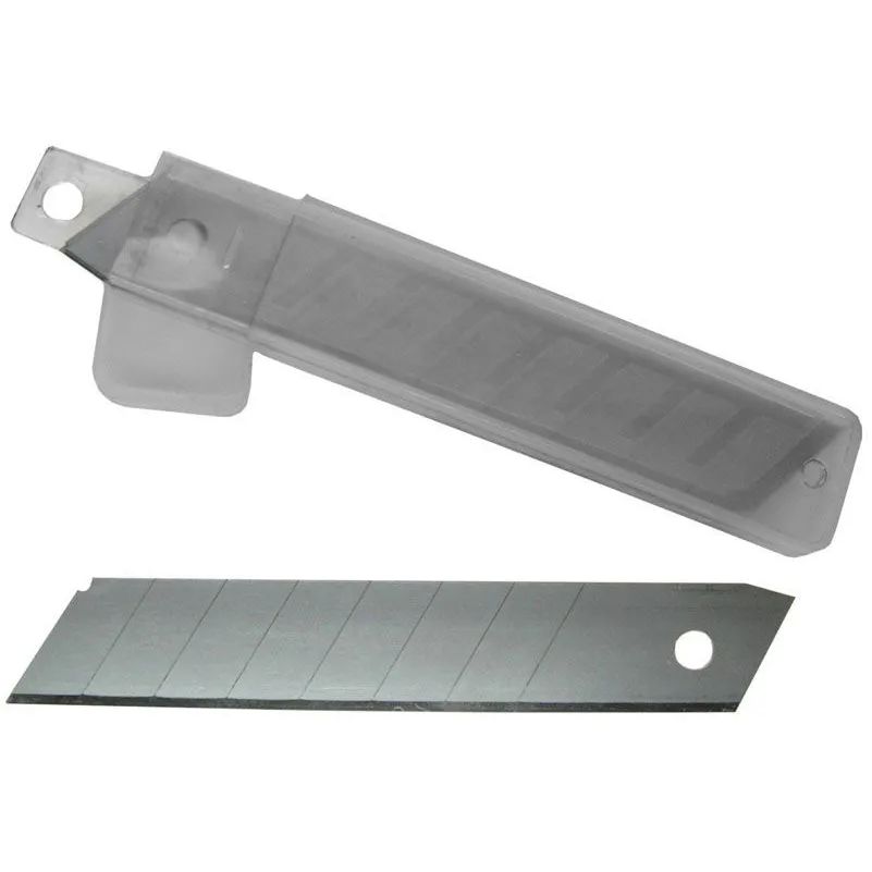 Набор лезвий для ножа технического 18 мм (10 шт.) «отламывающихся» изготовлен канадской фирмой FIT из легкой, но прочной инструментальной стали. Подходит для зажимного механизма крепления. Каждый клинок имеет 7 сегментов толщиной 18 мм и шириной 25 мм. Не требует затачивания, прост в использовании. Режущий край легко меняется за счет наличия поперечных канавок, облегчающих обламывание сегмента. Острая кромка легко справляется с нарезкой бумаги, пленки и нетвердого пластика. В комплекте также поставляется удобный пластиковый пенал для хранения запасных клинков.