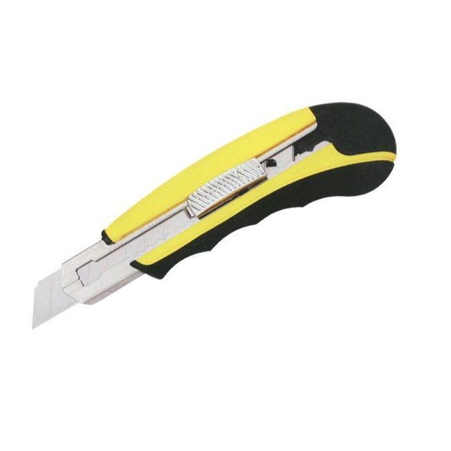 Нож технический усиленный с фиксатором лезвия. Обрезиненный корпус, три запасных лезвия.