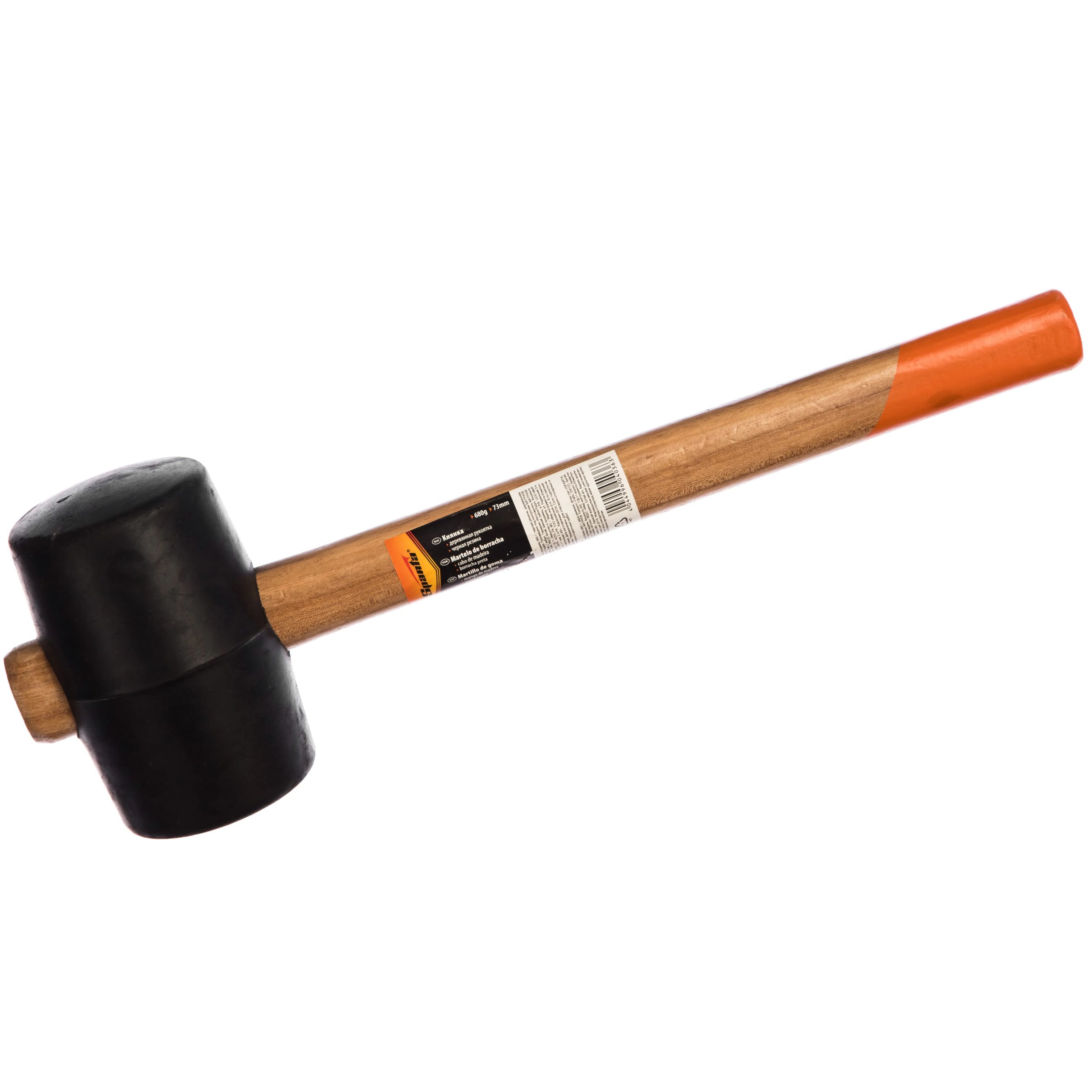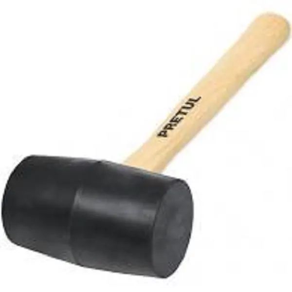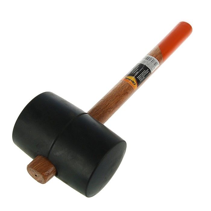 Резиновой киянкой с деревянной ручкой удобно пользоваться при укладке тротуарной плитки, выполнении монтажных и столярных работ. Она обладает выполненной из резины ударной частью. Форма бойка цилиндрическая, весит 680 г.