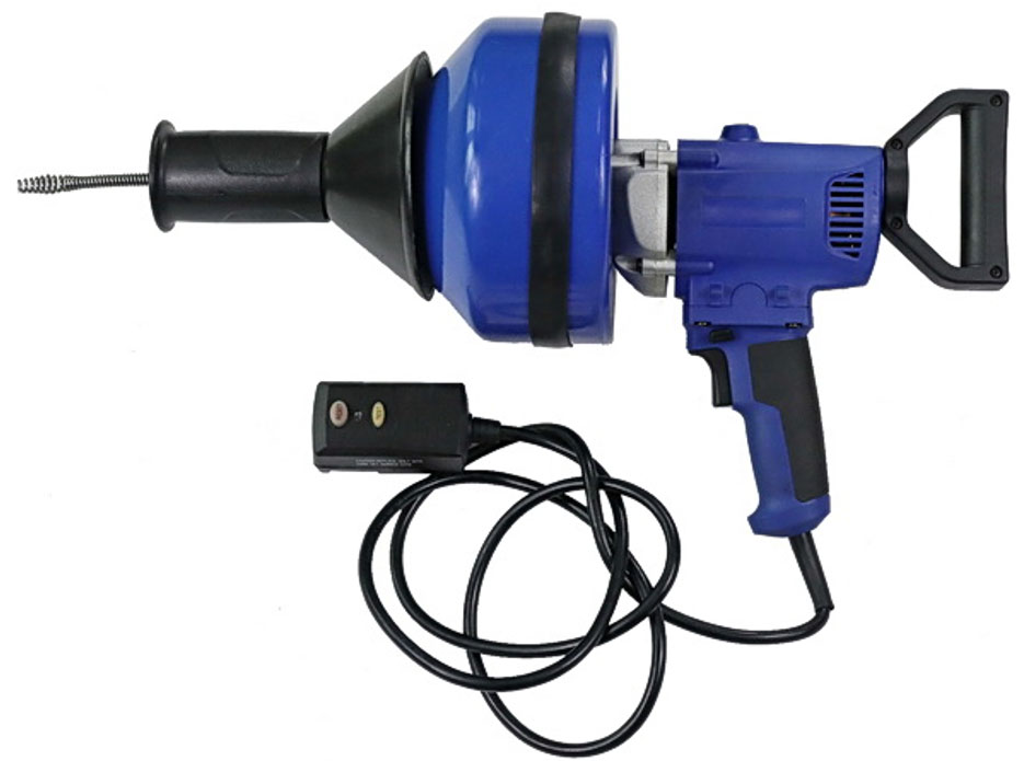 Подходит для труб диаметром от 20 до 75мм. В конструкции стальной барабан для удержания спирали и мощный привод с регулировкой оборотов. Спираль 8мм длиной 7,6 метра с усиленным многослойным сердечником.