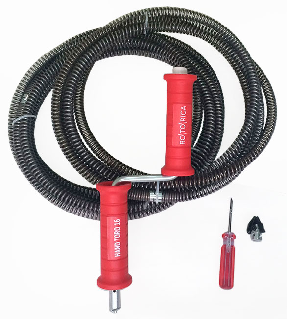 Для ручной прочистки труб диаметром до 100мм. В комплекте 4 спирали 16мм (общая длина 9.2м), 1 крестовая насадка, разъединительный ключ, приводная рукоятка.