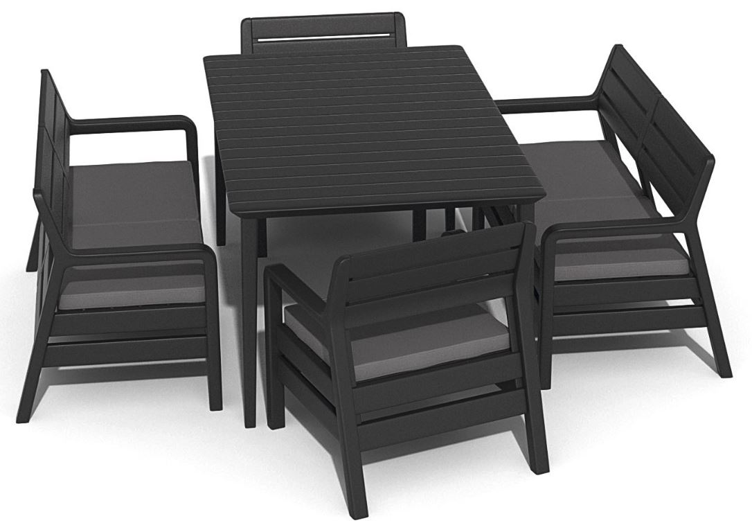 Делано — набор мебели с фактурой, напоминающей деревянные панели. В состав гарнитура входят 2 дивана, два кресла с подлокотниками и большой прямоугольный стол определяющий комплект как обеденный. Идеально подходит для использования на домашних балконах, террасах или в саду. Легко собирается и чистится. Стойкий к воздействию погодных условий и УФ-излучения.