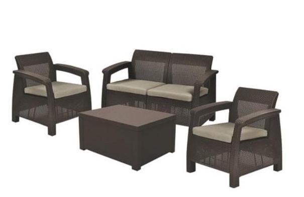 Corfu box — это элегантный мебельный гарнитур с фактурой, напоминающей ротанг, который состоит из двух кресел, двухместного дивана и столика-сундука. Продукт оснащён мягкими подушками сидений. В столе-сундуке всегда можно спрятать вещи от дождя. Мебель с легкой и одновременно устойчивой конструкцией красиво впишется в любое приусадебное пространство, такое как сад или терраса. Набор очень легко чистится. Изготовлен из стойкого к воздействию УФ-излучения пластмассы.