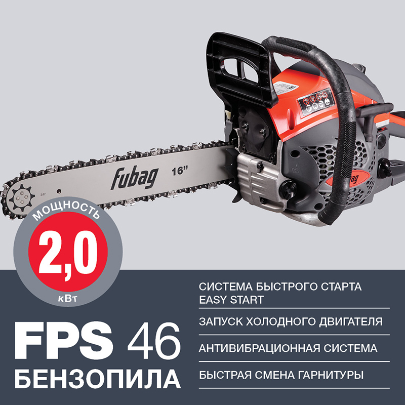 Бензопила FUBAG FPS 46 – оптимальный вариант для заготовки дров, ремонтно-строительных работ и валки небольших деревьев (диаметром до 35 см). Противоскользящее покрытие ручки, эффективная антивибрационная система, надежный инерционный тормоз цепи обеспечивают безопасную и комфортную работу.