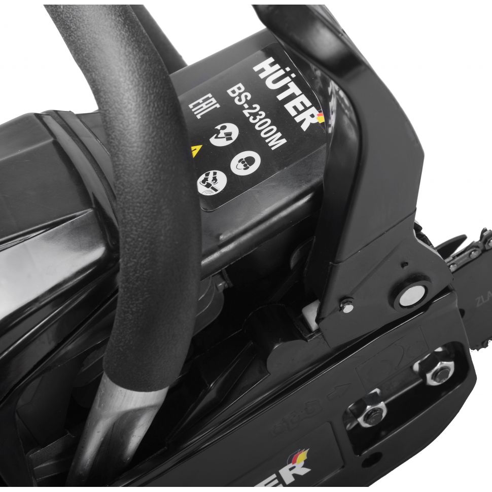 Бензопила BS-2300М Huter — надежная бензопила с шиной универсальной длины. Благодаря низкому расходу топлива можно справиться с задачами любой сложности. С ее помощью вы сможете заняться как заготовкой дров, так и использовать ее в строительстве. Безопасности в этой модели уделено много внимания. Блокировки курка газа предотвращает случайное нажатие. Функция механического инерционного тормоза цепи также важна: при резком отскоке пилы во время пиления (вверх и назад) рука упирается в ручку тормоза и отщелкивает ее, а тормозная лента затягивается и тормозит барабан сцепления, цепь при этом останавливается практически мгновенно. Защитный щиток в случае разрыва цепи или ее соскока с шины предотвращает травмирование. Резиновые амортизаторы, расположенные между рукоятками и картером пилы, снижают вредную вибрационную нагрузку при работе с бензопилой, делают работу комфортнее. Масляный бак размещается в передней части картера. Принудительная смазка цепи и шины применяется для снижения трения между ними, что увеличивает срок службы пильной гарнитуры. Легкий старт влияет на скорость запуска, особенно в зимний период. Он добавляет дополнительный крутящий момент при рывке.