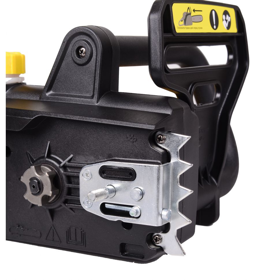 — Безопасность. Автоматический тормоз цепи в виде щитка обеспечивает безопасность работы с электропилой, в первую очередь, защиту ваших рук.
