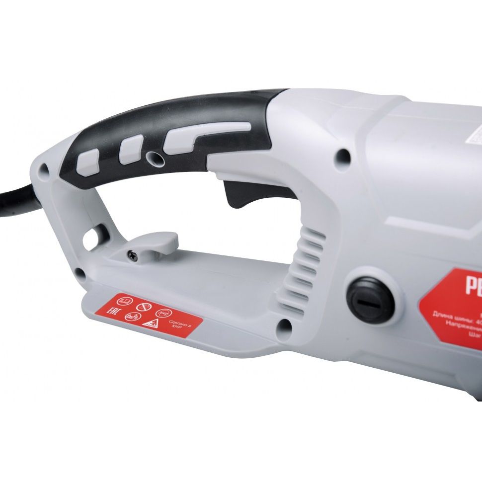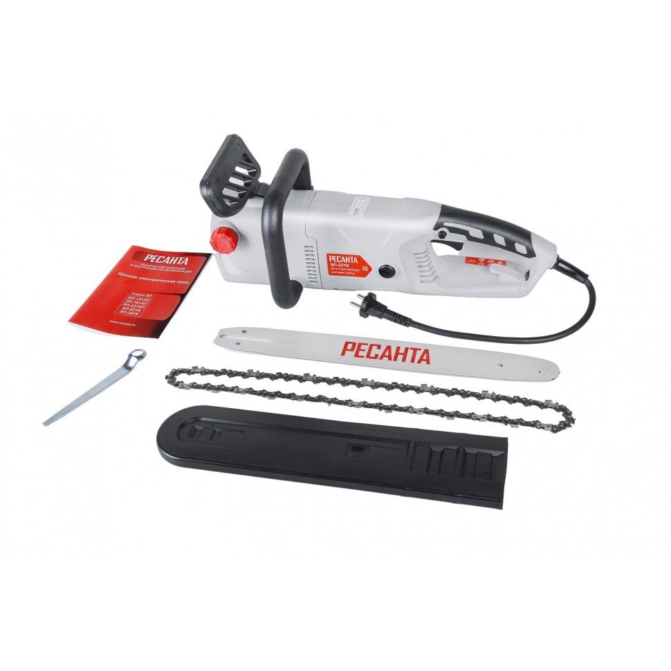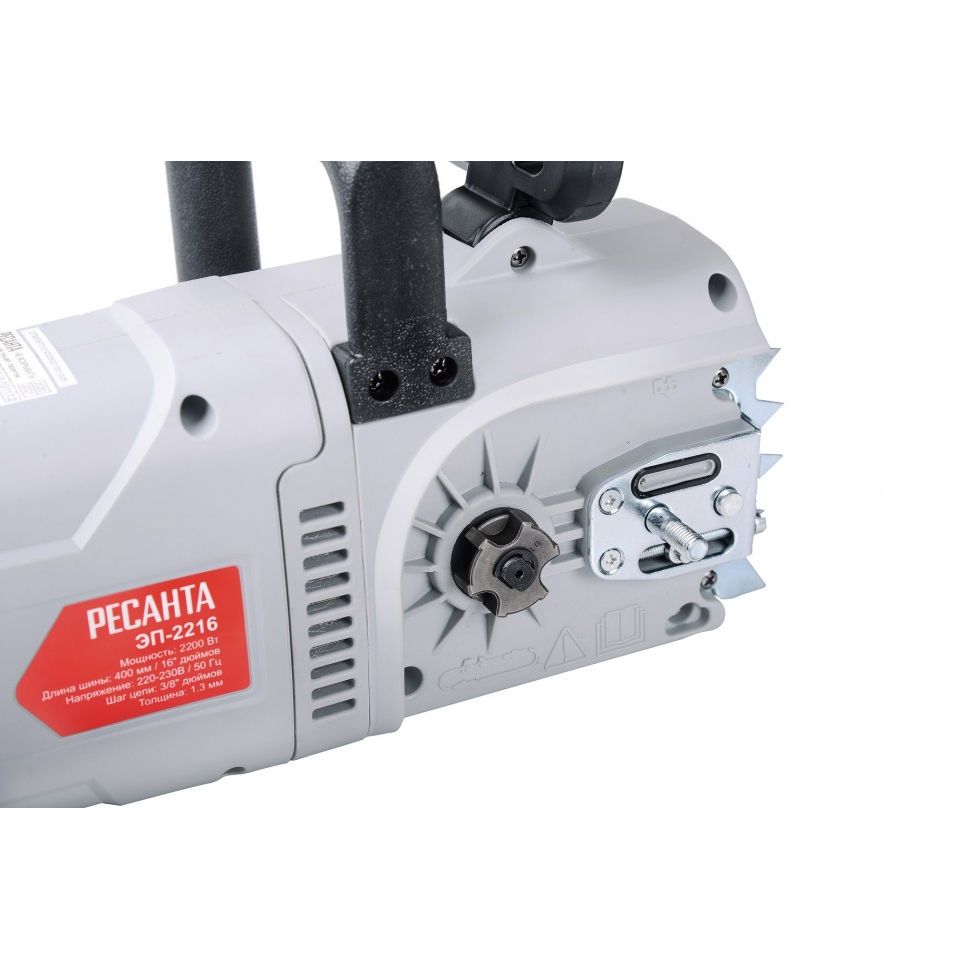 Отличительными особенностями электропилы Ресанта являются простота и удобство в работе, ведь она не требует заправки топливом и работает от сети 220В. Также стоит отметить низкий уровень шума, создаваемый при работе, а также полное отсутствие выхлопных газов. Это означает, что вы можете использовать пилу не только на улице, но и в помещении при ремонтных и строительных работах. Вы можете легко регулировать натяжение цепи с помощью винта, расположенного на корпусе справа. К характеристикам, обеспечивающим комфортное пользование инструментом, также можно отнести автоматическую смазку цепи. Чтобы вы смогли определить уровень смазки для цепи, в корпусе есть смотровое окошко с делениями. Единственная особенность — это недостаточная мобильность, ведь пользоваться инструментом можно только в непосредственной близости от розетки переменного тока 220В. Этот легко исправить, используя переноску (с кабелем подходящего сечения!) или бензогенератор Ресанта. Для электропилы ЭП-2216 подойдут цепи со следующими параметрами: количество звеньев 57, шаг цепи 3/8, толщина ведущего звена 1.3, шина 161.