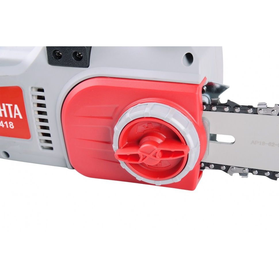Отличительными особенностями электропилы Ресанта являются простота и удобство в работе, ведь она не требует заправки топливом и работает от сети 220В. Также стоит отметить низкий уровень шума, создаваемый при работе, а также полное отсутствие выхлопных газов. Это означает, что вы можете использовать пилу не только на улице, но и в помещении при ремонтных и строительных работах. Вы можете легко регулировать натяжение цепи с помощью винта, расположенного на корпусе справа. К характеристикам, обеспечивающим комфортное пользование инструментом, также можно отнести автоматическую смазку цепи. Чтобы вы смогли определить уровень смазки для цепи, в корпусе есть смотровое окошко с делениями. Единственная особенность — это недостаточная мобильность, ведь пользоваться инструментом можно только в непосредственной близости от розетки переменного тока 220В. Этот легко исправить, используя переноску (с кабелем подходящего сечения!) или бензогенератор Ресанта. Для электропилы ЭП-2418 подойдут цепи со следующими параметрами: количество звеньев 63, шаг цепи 3/8, толщина ведущего звена 1.3, шина 181E.