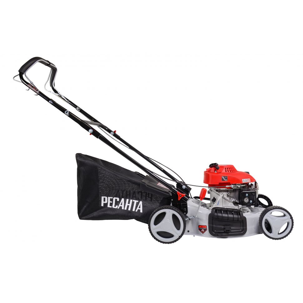 • Более широкий набор дополнительных опций, таких как боковой выброс, мульчирование или самоходность (привод на колёса). Особенности бензиновой газонокосилки Ресанта: • Все металлические части конструкции окрашены, что предохраняет их от коррозии.