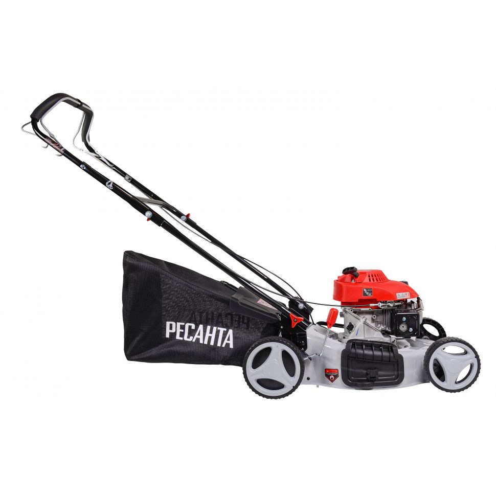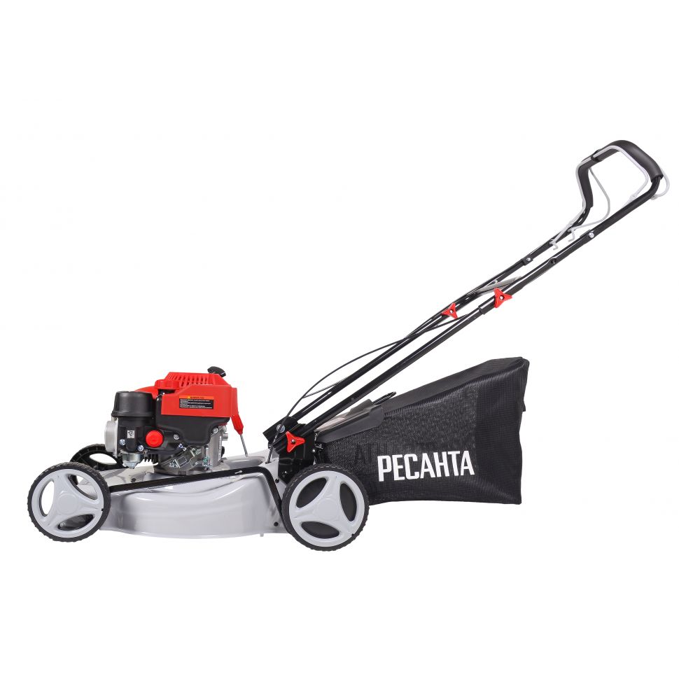 • Более широкий набор дополнительных опций, таких как боковой выброс, мульчирование или самоходность (привод на колёса). Особенности бензиновой газонокосилки Ресанта: • Все металлические части конструкции окрашены, что предохраняет их от коррозии.