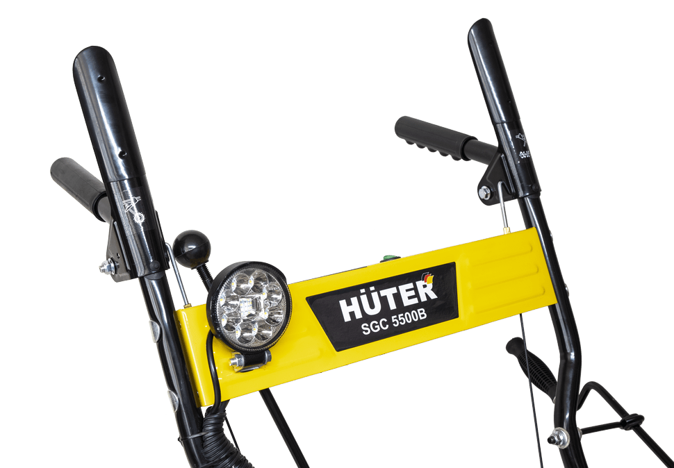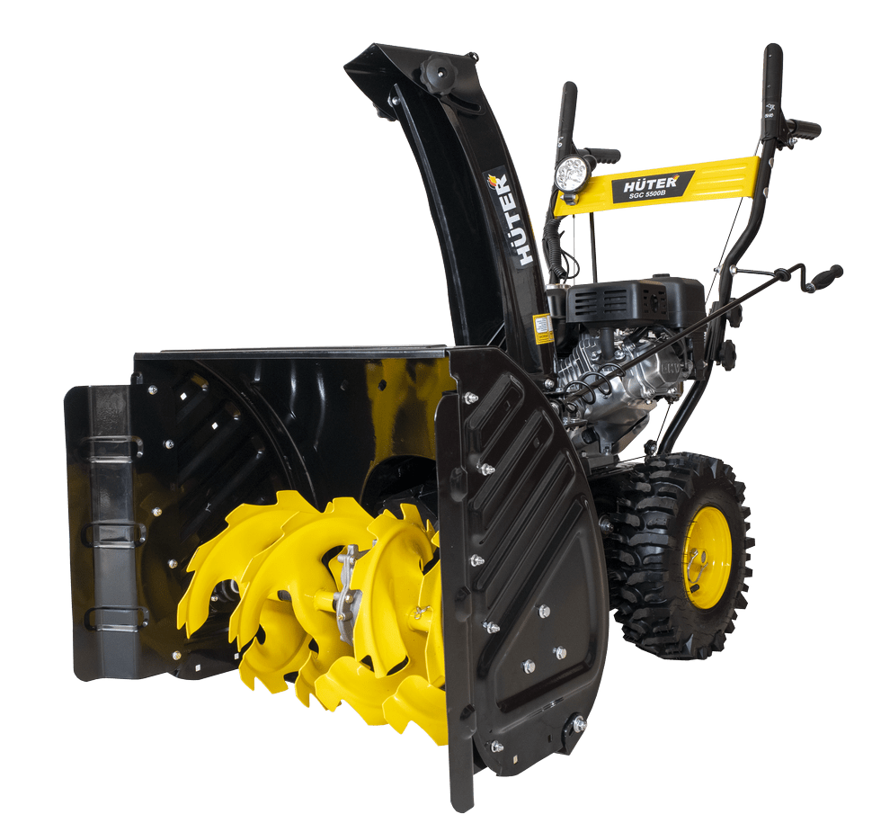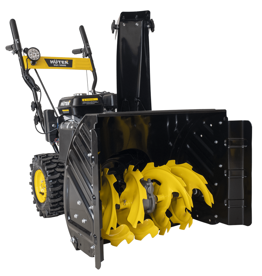 Модель Huter SGC-5500B комплектуется покрышками с зимним рисунком протекторов. Это повышает сцепление колес со скользкой поверхностью, исключает пробуксовку и облегчает управление самоходной машиной. Коробка передач с 5 скоростями вперед и 2 назад обеспечивает хорошую маневренность. Шнек с металлическими лопастями способен захватывать и измельчать слежавшийся снег.