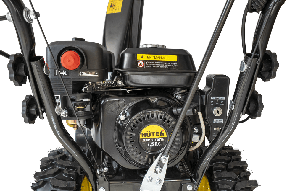 Снегоуборщик имеет бензиновый ДВС с верхним расположением клапанов мощностью 7,5 л.с. Конструкция мотора рассчитана на работу при отрицательных температурах. Электростартер от АКБ 12 В обеспечивает автономный запуск снегоуборщика без привязки к электросети. Объема топливного бака 3,6 л хватит на 2-3 часа непрерывной работы.
