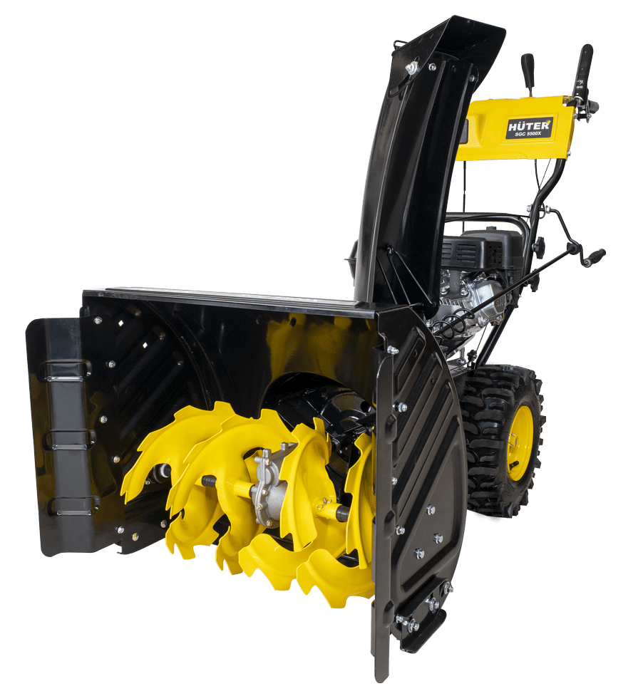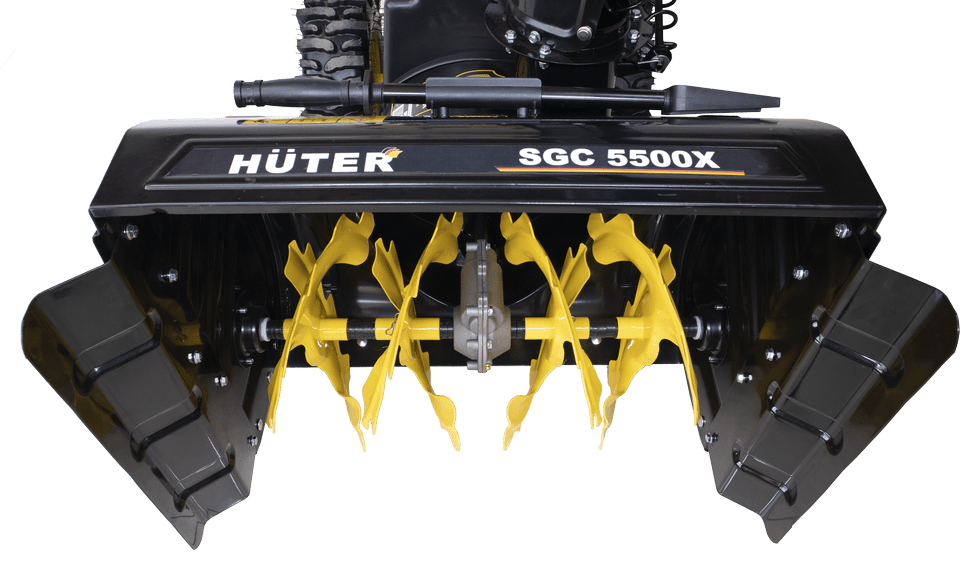 Снегоуборщик Huter SGC 5500X — самоходный агрегат весом 76 кг. Отличается маневренностью и удобством управления. Модель оснащена двумя надувными шипованными колесами с глубоким протектором. Они обеспечивают качественное сцепление с поверхностью, уверенно перемещаясь по рыхлому снегу и обледенелым участкам. Рукоятка на панели управления позволяет изменять направление выброса снега на 190º. Дальность выброса достигает 15 м. Металлические детали устойчивы к образованию коррозии, обеспечивают длительный срок эксплуатации.