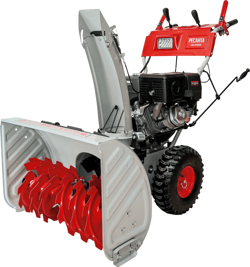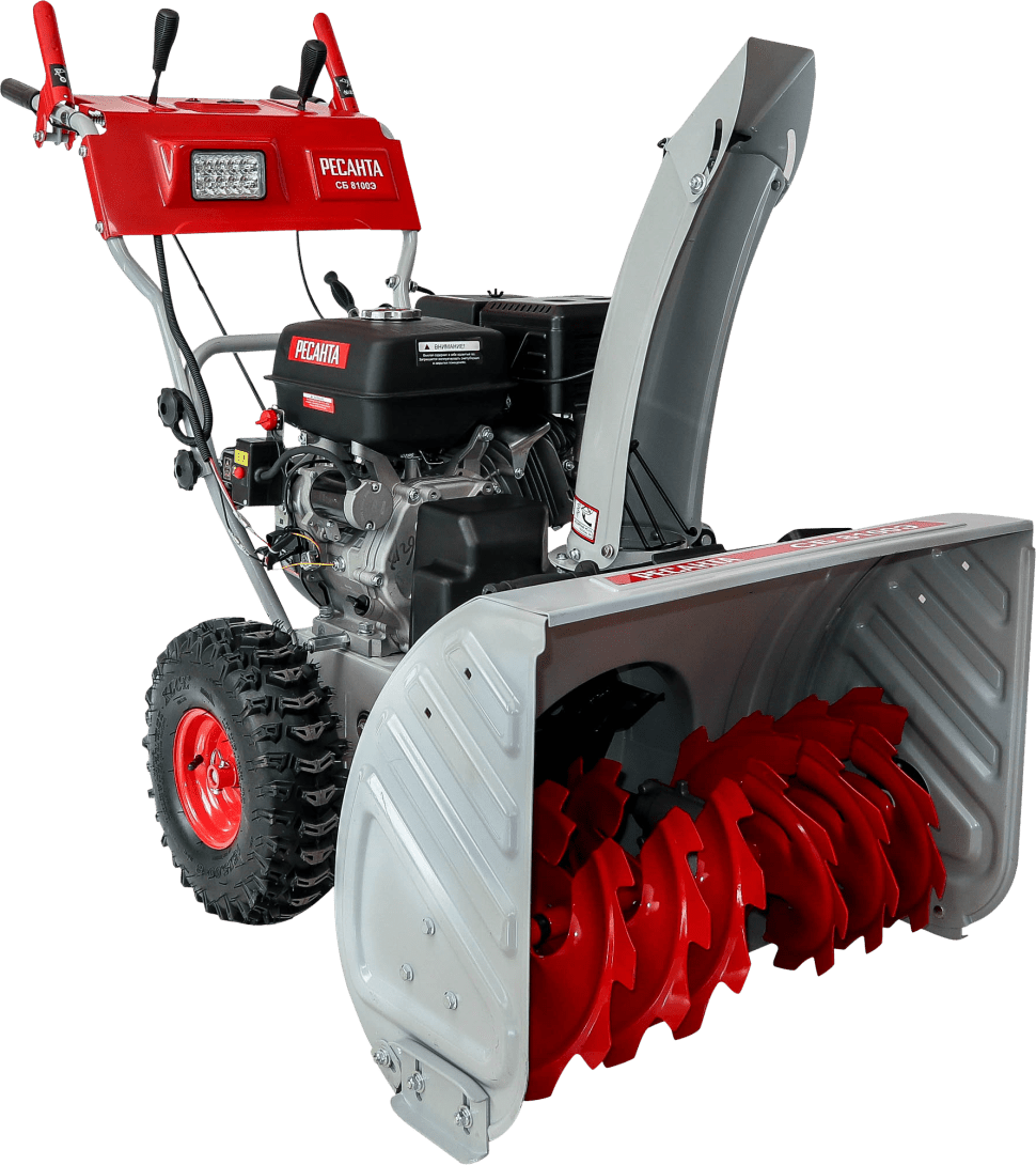 Модель СБ 8100Э имеет 6 скоростей вперёд и 2 – назад. Захватываемый снег через жёлоб выбрасывается в сторону. Дальность выброса регулируется специально предусмотренным рычагом, который вместе с регулировкой скоростей и электростартером, работающим от сети 220 В, расположен на операционной панели. Высокую проходимость снегоуборщика обеспечивают два колеса с агрессивным протектором. Для удобства работы в модели Ресанта СБ 8100Э имеется фара и реализован подогрев ручек. Объём топливного бака – 6.5 л. Вес снегоуборщика – 110 кг.