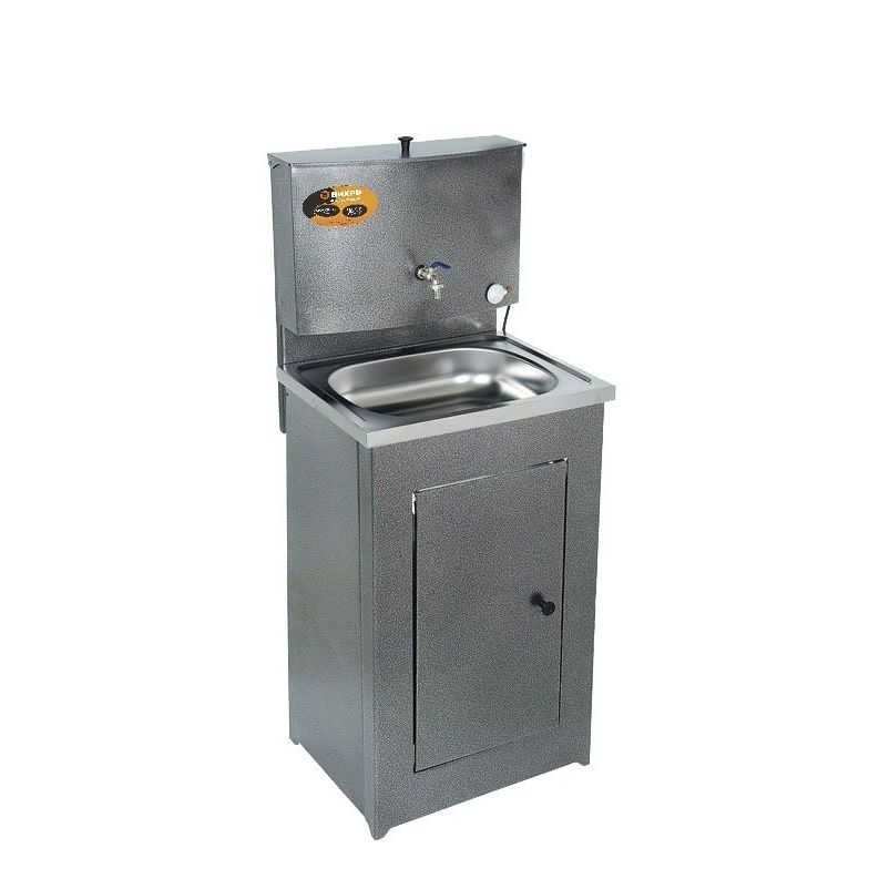 Умывальник с подогревом, белого цвета, с тумбой и пластиковой мойкой, от российского производителя ВИХРЬ. В городах все привыкли к центральному водоснабжению, но на дачах такое благо есть не у всех, что вызывает определённые неудобства, но проблема вполне решаема. При помощи умывальника можно умыться, вымыть не только руки, но ещё и посуду и овощи. Такое устройство просто незаменимо в быту, с ним комфортно и удобно. Умывальники настолько удобны, что могут стать заменой полноценного водопровода.Умывальник ВИХРЬ отличается особой функциональностью, так как его можно установить как внутри дома, так и снаружи. Внутри тумбочки ставиться ведро или шланг для слива воды. Так как в таком умывальнике есть раковина, то его можно свободно использовать для мытья посуды.Умывальник с подогревом наиболее комфортный вариант для дачи, т.к. в случае отсутствия центрального водоснабжения, он поможет решить проблему подачи воды и сделает её горячей. Такой умывальник можно установить в летней кухне, внутри дома, на террасе, то есть там, где имеется розетка для подключения нагревательного элемента. Преимущества: