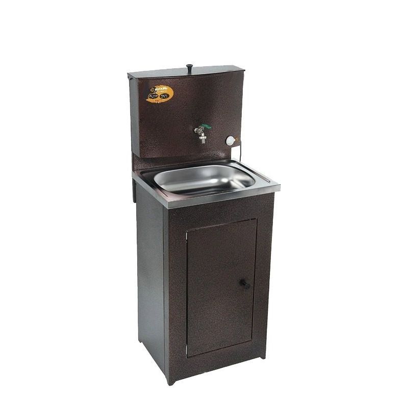Умывальник с подогревом, медного цвета, с тумбой и нержавеющей мойкой, от российского производителя ВИХРЬ. В городах все привыкли к центральному водоснабжению, но на дачах такое благо есть не у всех, что вызывает определённые неудобства, но проблема вполне решаема. При помощи умывальника можно умыться, вымыть не только руки, но ещё и посуду и овощи. Такое устройство просто незаменимо в быту, с ним комфортно и удобно. Умывальники настолько удобны, что могут стать заменой полноценного водопровода.Умывальник ВИХРЬ отличается особой функциональностью, так как его можно установить как внутри дома, так и снаружи. Внутри тумбочки ставиться ведро или шланг для слива воды. Так как в таком умывальнике есть раковина, то его можно свободно использовать для мытья посуды.Умывальник с подогревом наиболее комфортный вариант для дачи, т.к. в случае отсутствия центрального водоснабжения, он поможет решить проблему подачи воды и сделает её горячей. Такой умывальник можно установить в летней кухне, внутри дома, на террасе, то есть там, где имеется розетка для подключения нагревательного элемента. Преимущества: