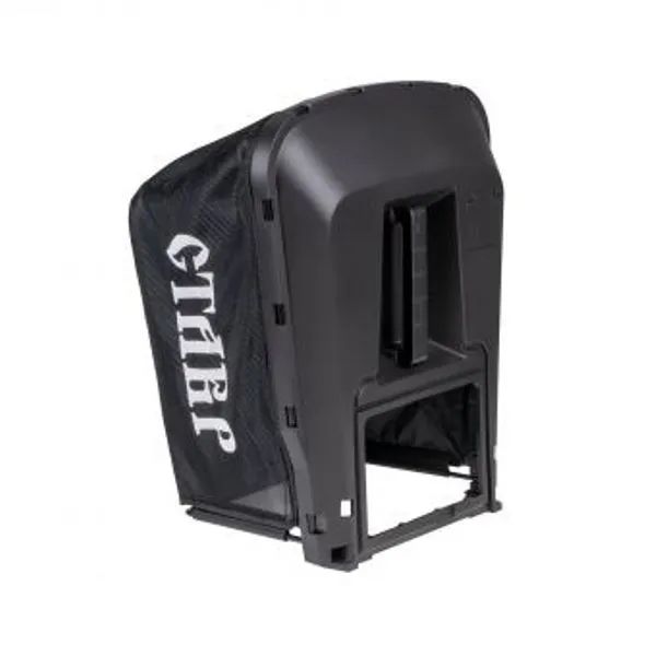КОМПЛЕКТАЦИЯ: Травосборник, Нож (установлен), Крюк крепления кабеля, Рукоятка, Основание рукоятки – 2 шт., Комплект крепежа – 1 комп., Колесо – 4 шт. (установлен)