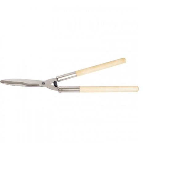 Кусторез с деревянными рукоятками и волнистыми ножницеобразными лезвиями.