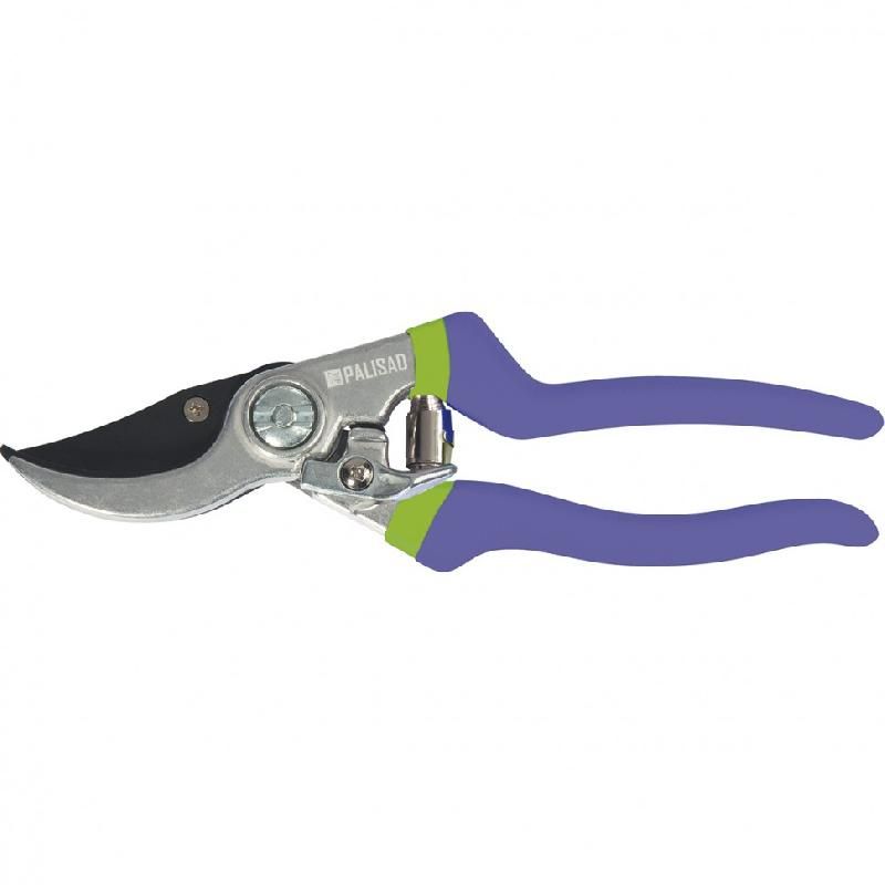 Секатор с прямым резом, обрезиненными рукоятками и боковым фиксатором.
