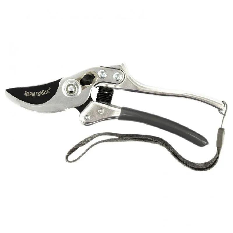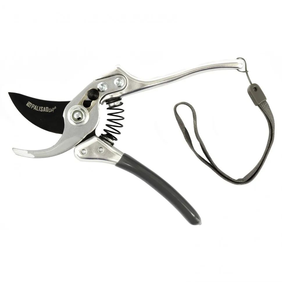 Усиленный секатор с прямым резом, металлическими рукоятками и боковым фиксатором.