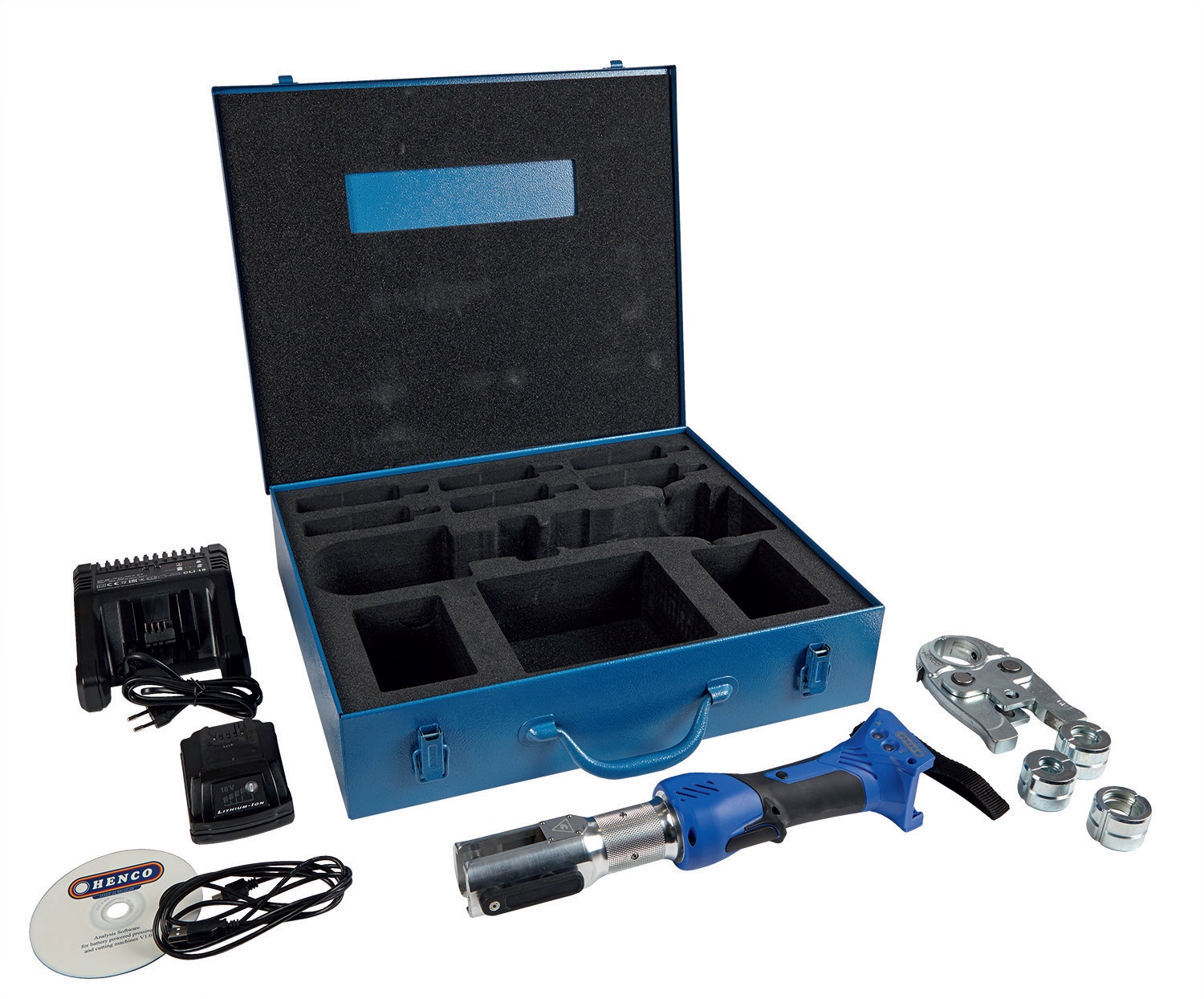 Аккумуляторный гидравлический пресс для обжима фитингов труб диаметром до 32мм. В наборе с клещами и вкладышами BE16H, BE20H, BE26H. Совместим с мини пресс-клещами основных производителей пресс-инструмента. Усилие 15кН. Аккумулятор 18В, 1.5Ач, Li-Ion.