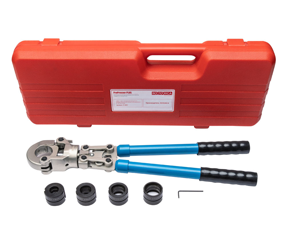 Комплект для ручного прессования радиальных пресс-фитингов полимерных и металлополимерных труб с контуром обжатия ТН. Универсальный ручной пресс-инструмент для пресс-вкладышей. Телескопические рукоятки. Поворотная пресс-головка на 360 о. Четыре комплекта пресс-вкладышей от 16 до 32 мм.