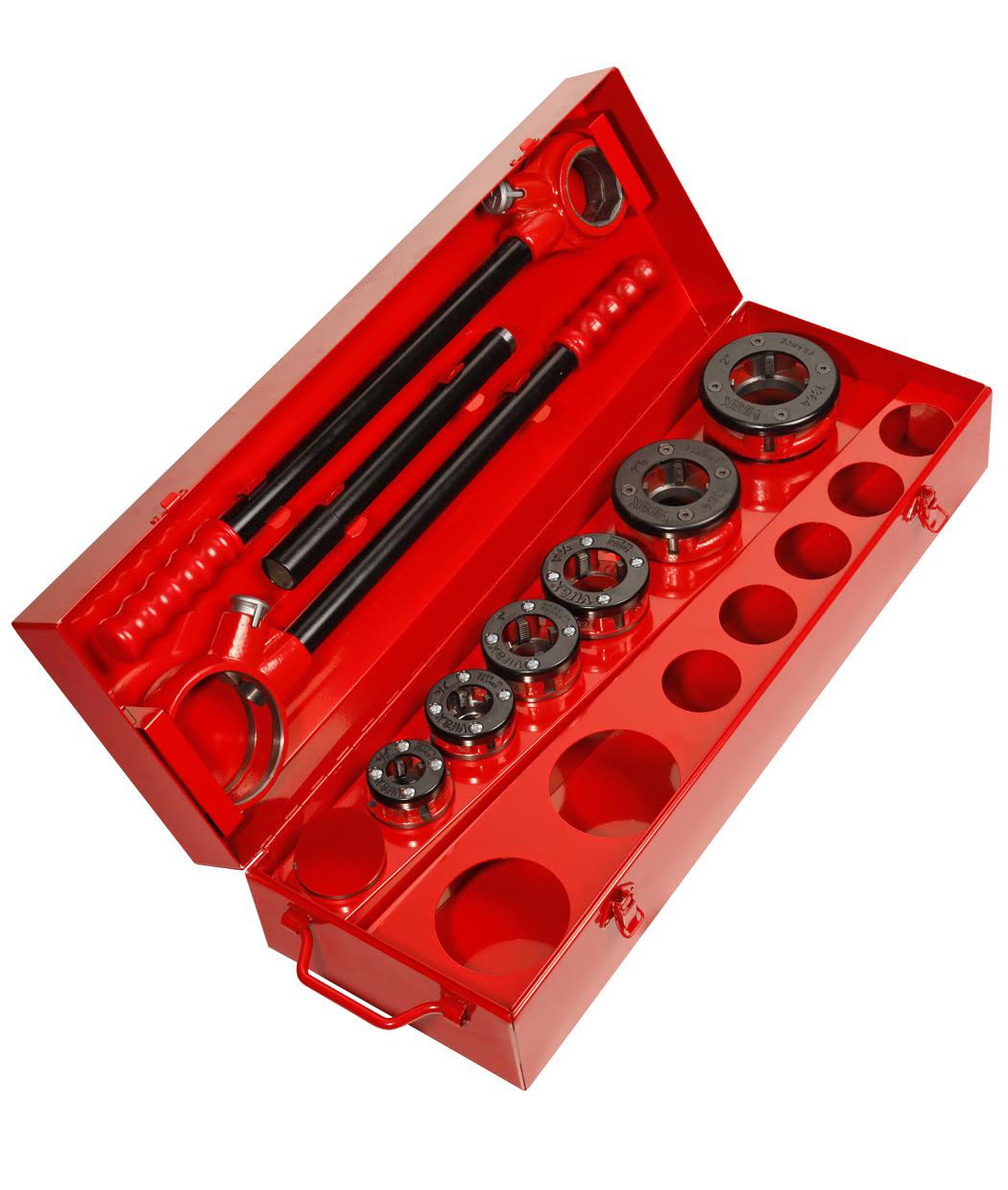 Резьбонарезной набор в стальном кейсе с двумя односекционными трещотками и головками BSPT R 1/2-3/4-1-1.1/4-1.1/2-2″.